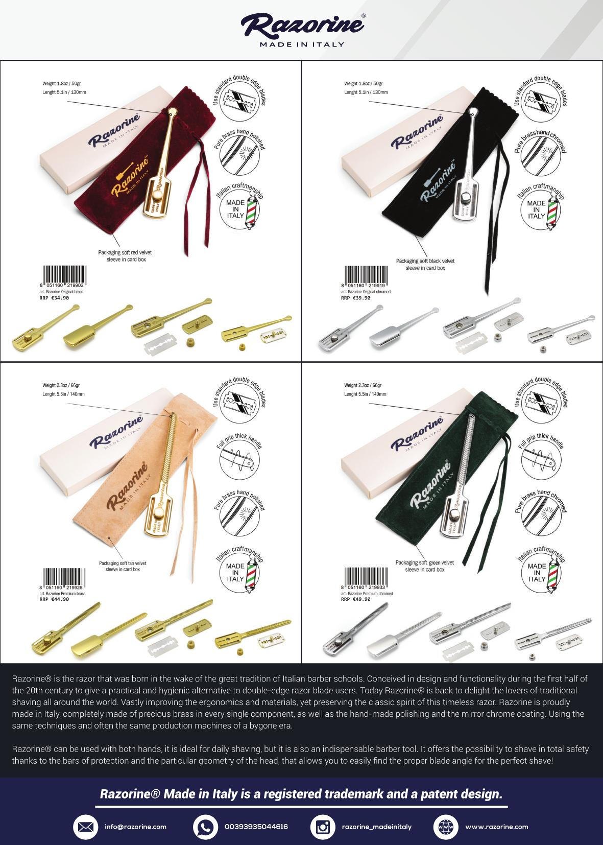 Razorine® is the razor that was born in the wake of the great tradition of Italian barber schools.Conceived in design and functionality during the first half of the 20th century to give a practical and hygienic alternative to double-edge razor blade users. Today Razorine® is back to delight the lovers of traditional shaving all around the world. Vastly improving the ergonomics and materials, yet preserving the classic spirit of this timeless razor. Razorine is proudly made in Italy, completely made of precious brass in every single component, as well as the hand-made polishing and the mirror chrome coating. Using the same techniques and often the same production machines of a bygone era.Razorine® can be used with both hands, it is ideal for daily shaving, but it is also an indispensable barber tool. It offers the possibility to shave in total safety thanks to the bars of protection and the particular geometry of the head, that allows you to easily find the proper blade angle for the perfect shave!Razorine® Made in Italy is a registered trademark and a patent design.
