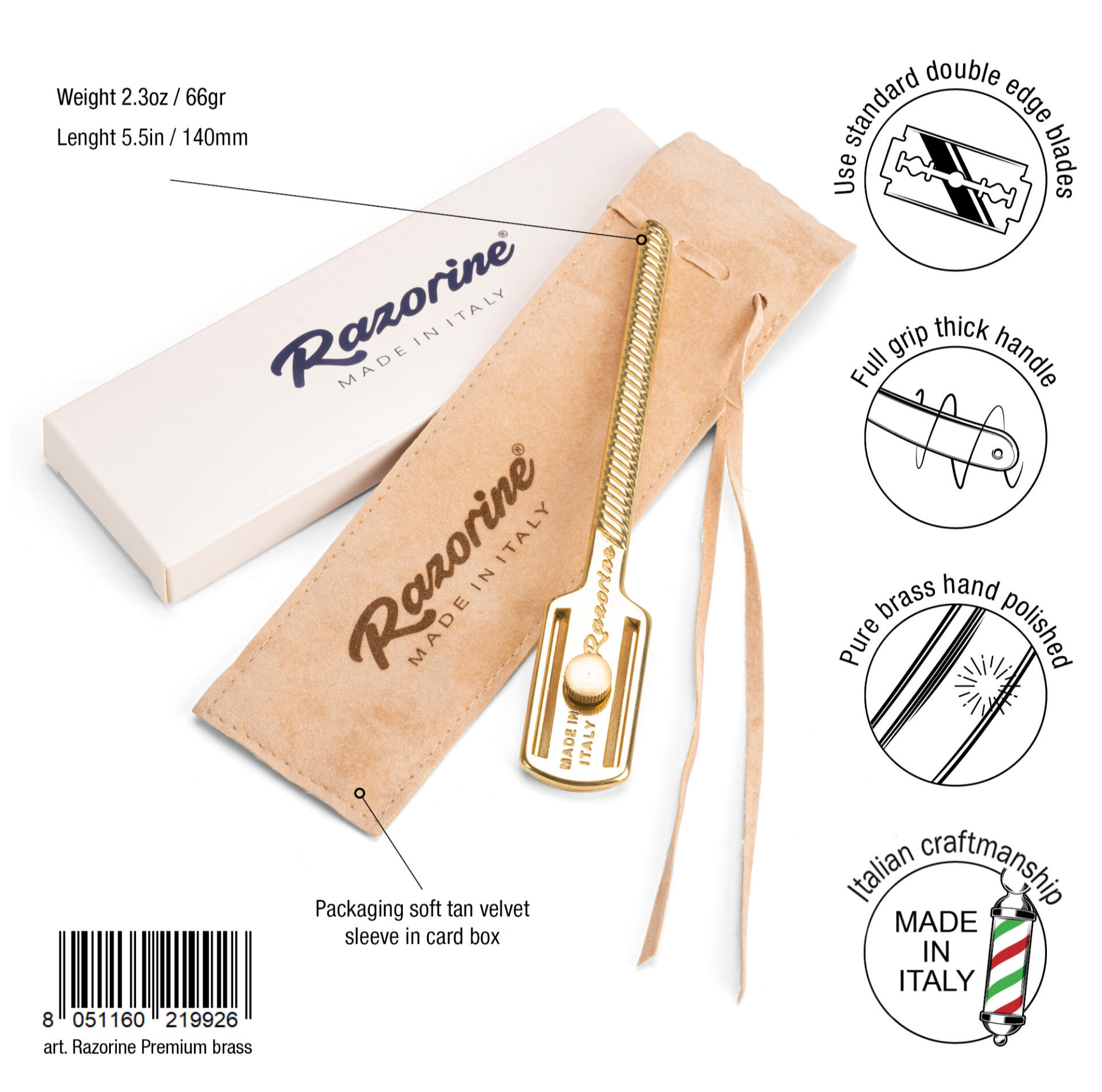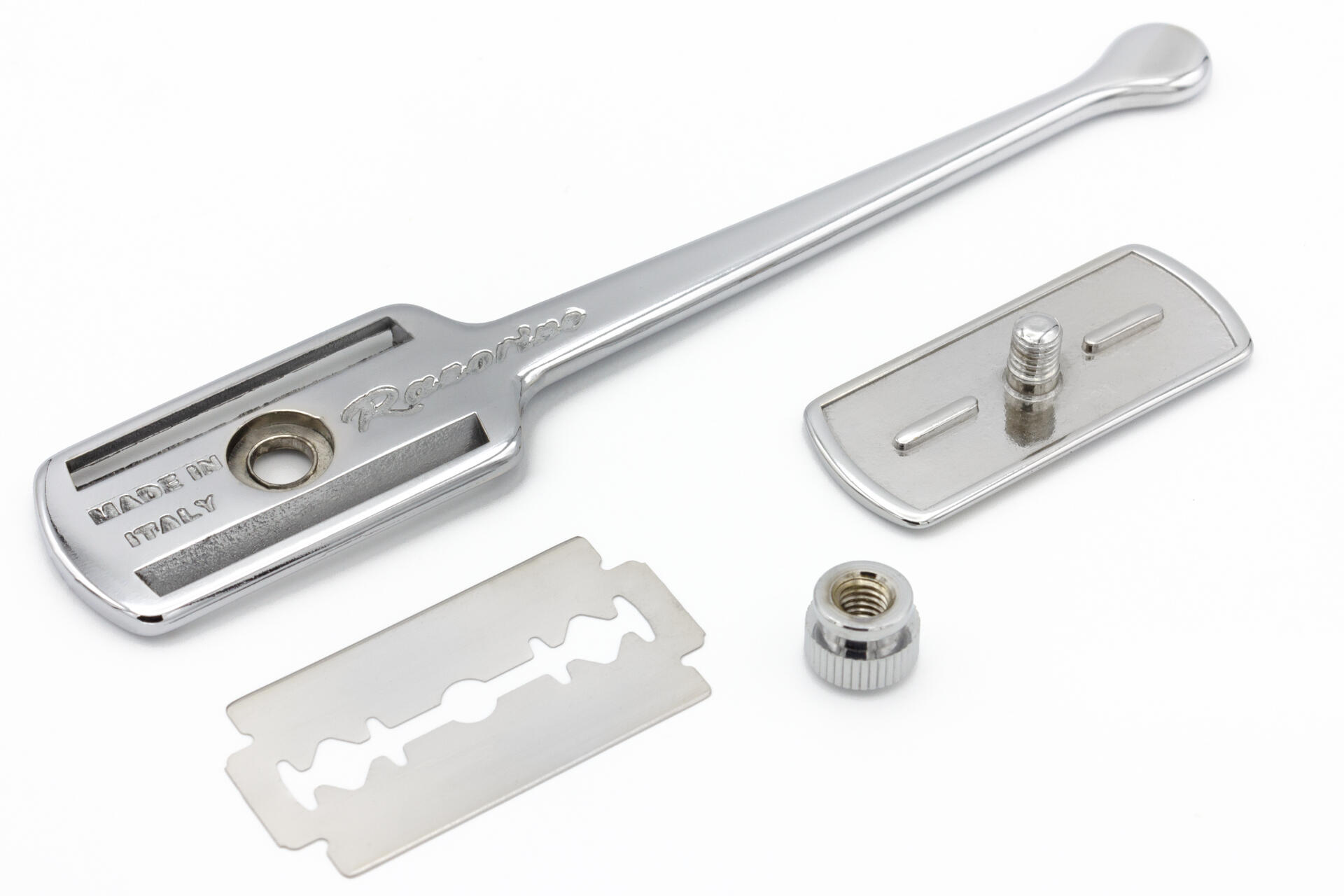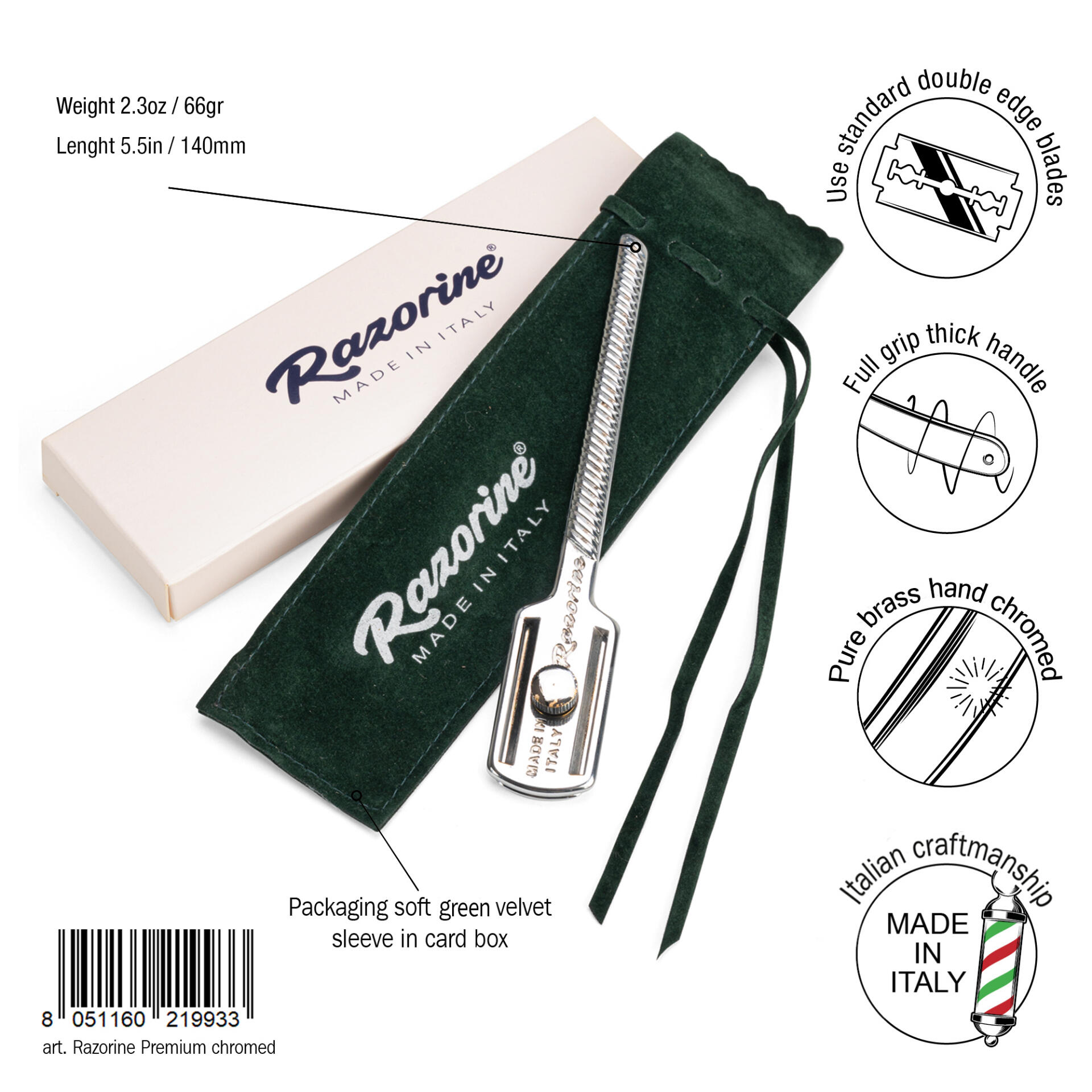 Razorine® is the razor that was born in the wake of the great tradition of Italian barber schools.Conceived in design and functionality during the first half of the 20th century to give a practical and hygienic alternative to double-edge razor blade users. Today Razorine® is back to delight the lovers of traditional shaving all around the world. Vastly improving the ergonomics and materials, yet preserving the classic spirit of this timeless razor. Razorine is proudly made in Italy, completely made of precious brass in every single component, as well as the hand-made polishing and the mirror chrome coating. Using the same techniques and often the same production machines of a bygone era.Razorine® can be used with both hands, it is ideal for daily shaving, but it is also an indispensable barber tool. It offers the possibility to shave in total safety thanks to the bars of protection and the particular geometry of the head, that allows you to easily find the proper blade angle for the perfect shave!Razorine® Made in Italy is a registered trademark and a patent design.