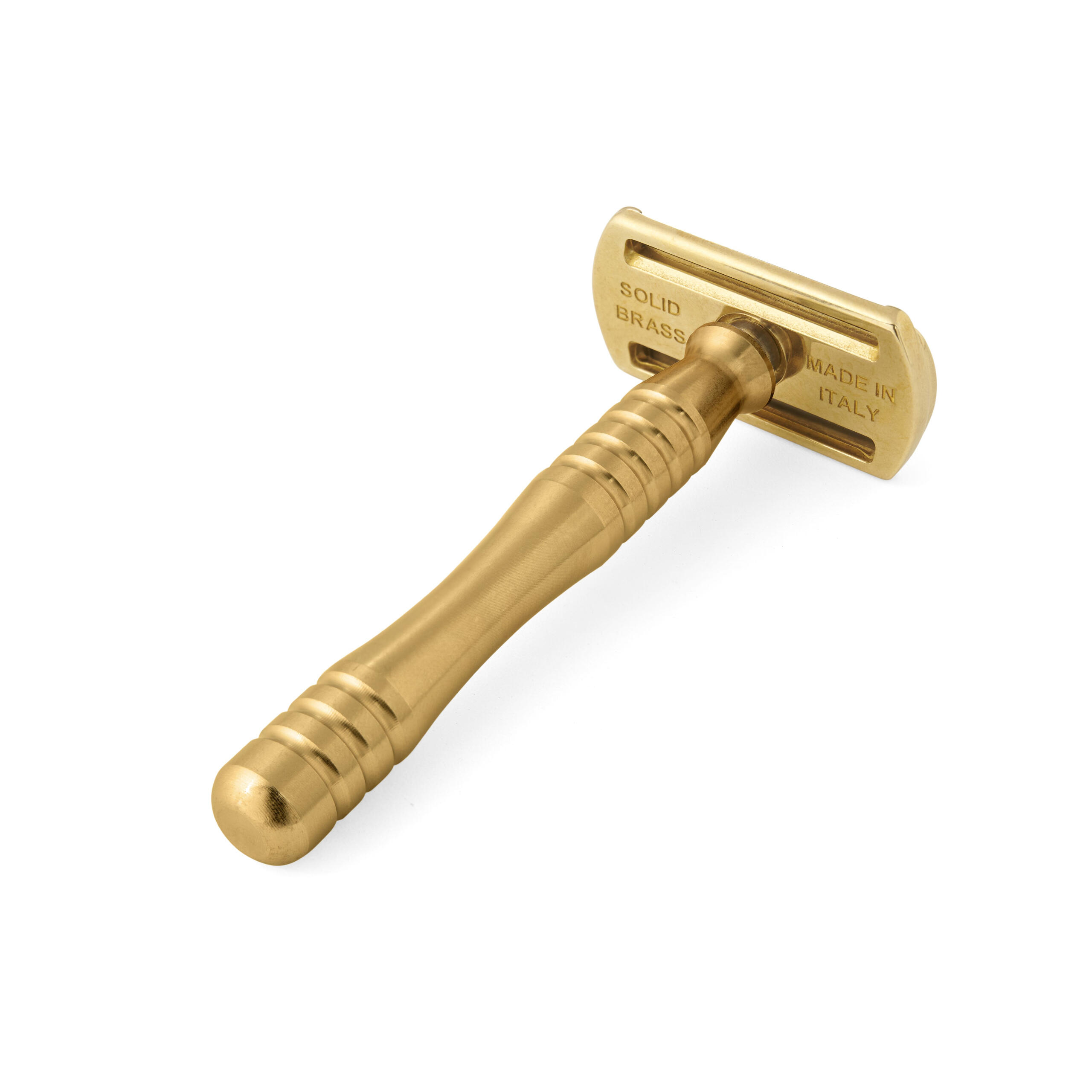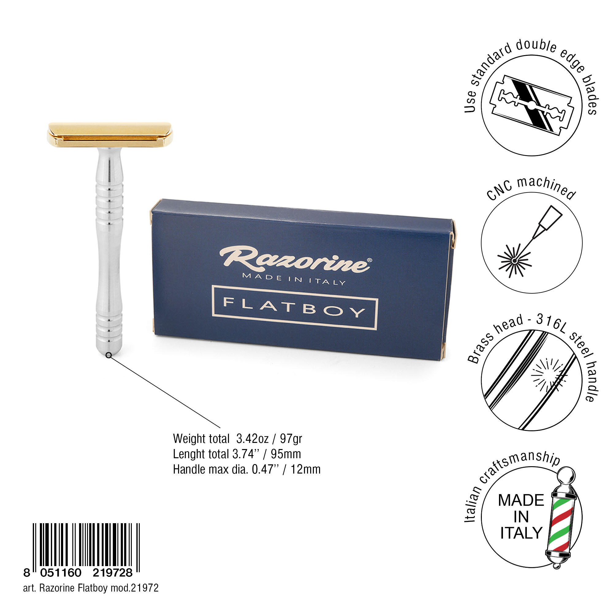 RAZORINE FLATBOY is the safety razor that mounts the legendary Razorine head and the exclusive flat blade design that allows for gentle and deep shaves. The solid brass head is machined from solid brass with sophisticated CNC machines and has no welded parts. It is then finished with a triple hand polishing process. The handle, CNC turned, is in pure brass. RAZORINE FLATBOY is your safety razor destined to last a lifetime, to be handed down from father to son. Like all RAZORINE production, the FLATBOY series is proudly made entirely in Italy, with first choice Italian material.